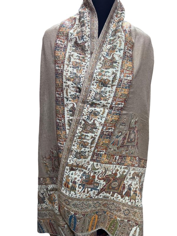 A Woolen Shikargah Kani Shawl is a type of traditional shawl that originates from the Kashmir region in India. It is known for its intricate and elaborate designs, which are created using a special weaving technique known as Kani. The word “Shikargah” refers to hunting scenes, and the shawl often features motifs of animals, birds, and nature.